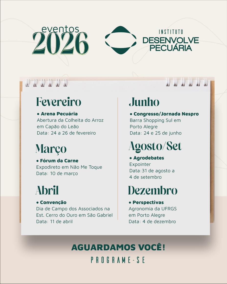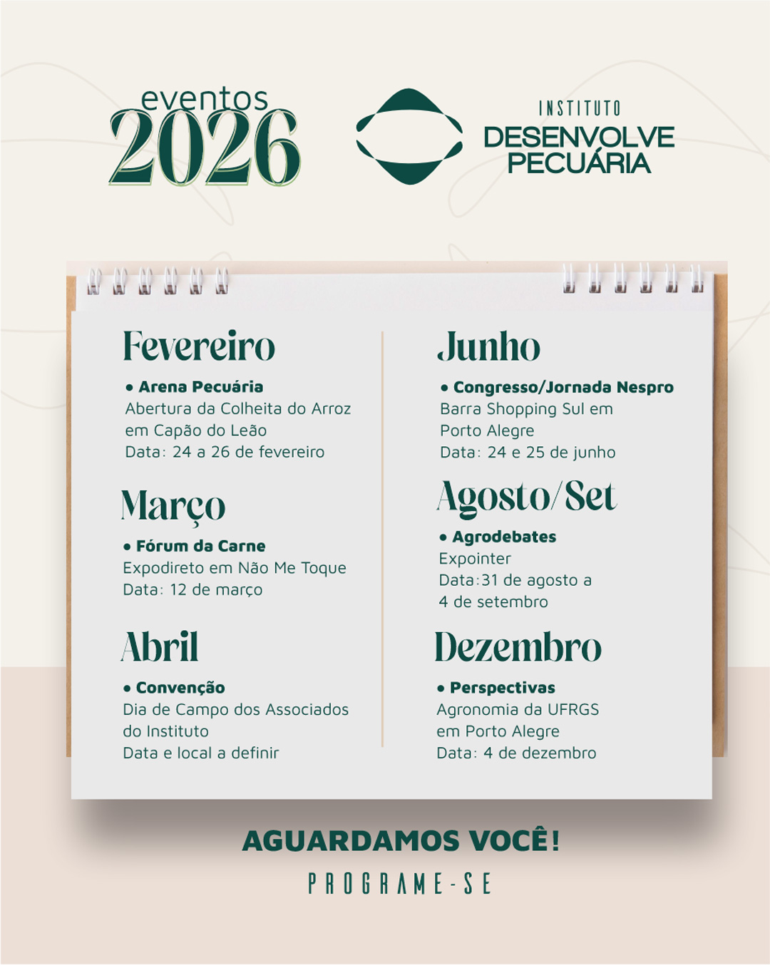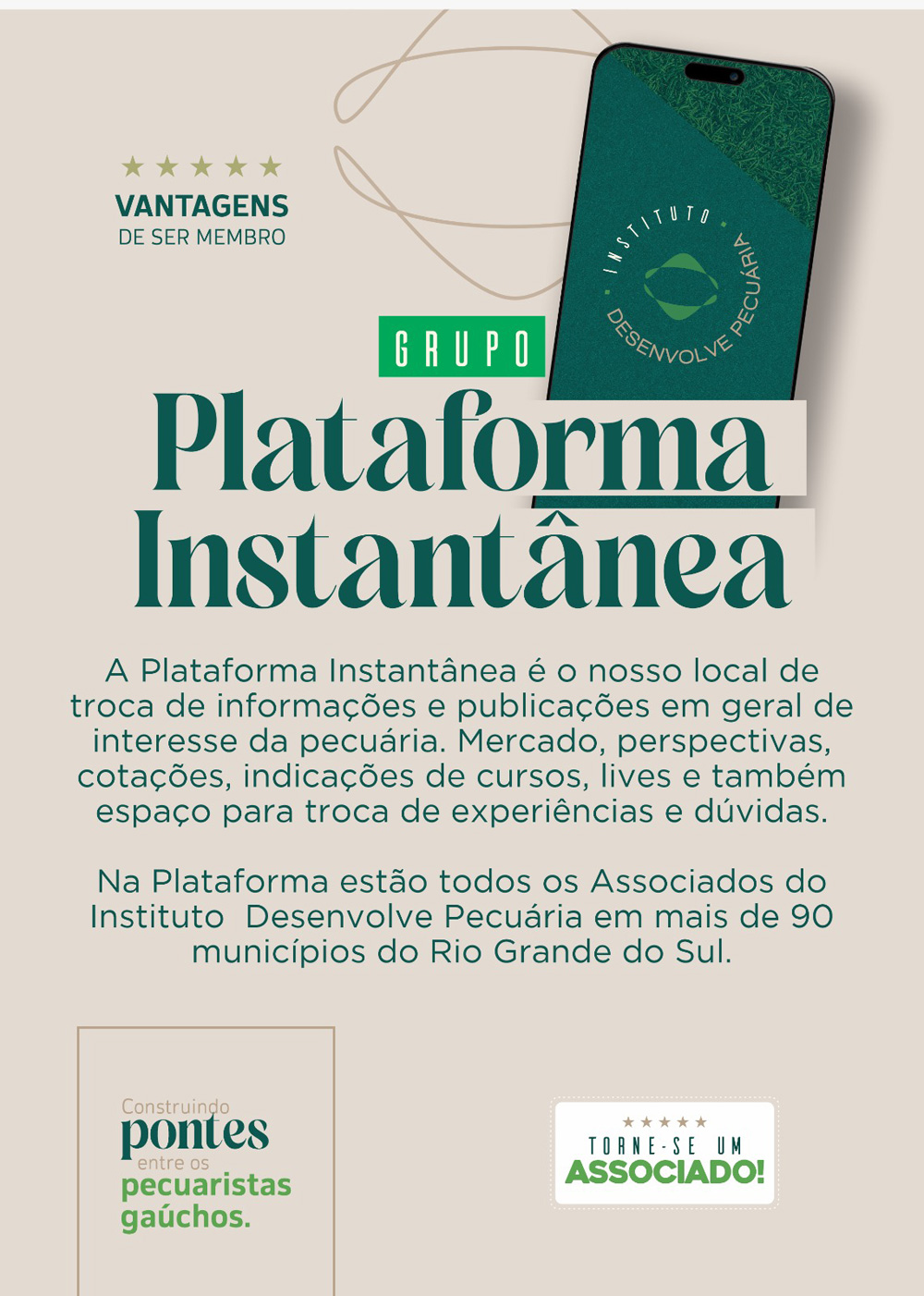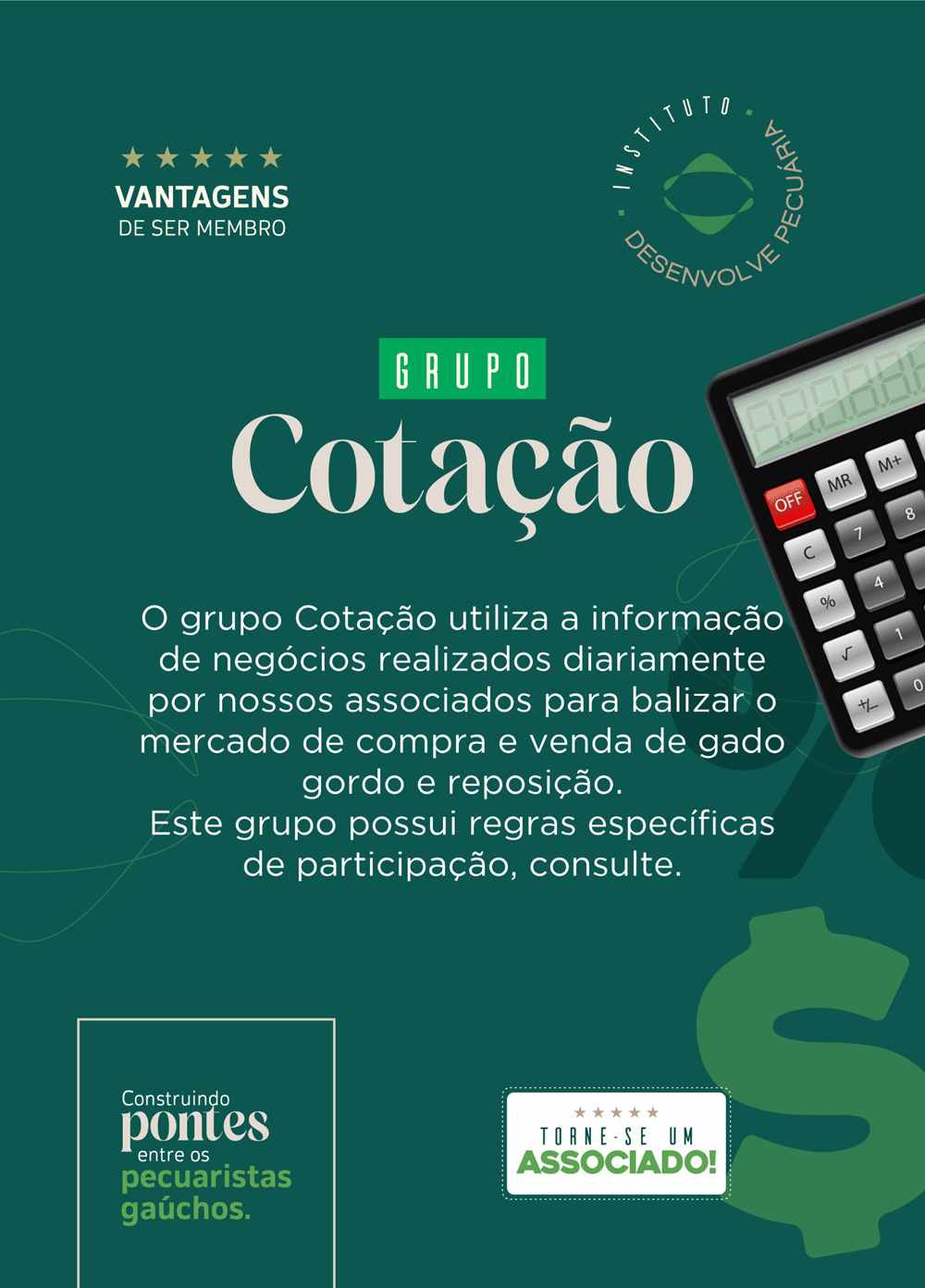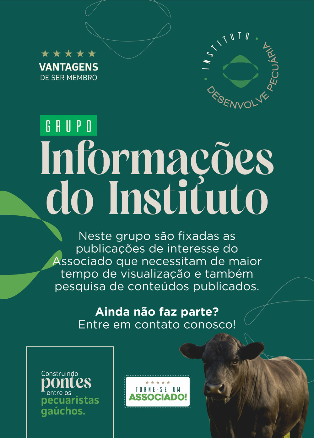 Todo material e serviço encontrado nas páginas do Instituto Desenvolve Pecuária (textos, imagens, áudio, tecnologia, logotipos, slogans, marcas, expressões de propaganda, domínios, nomes comerciais, obras intelectuais), bem como os softwares que viabilizam as atividades, são de exclusiva propriedade do Instituto Desenvolve Pecuária, que detém todos os direitos autorais, licenciamentos e direitos de propriedade, marca ou patente a eles relativos. Qualquer violação dos direitos de propriedade pelo usuário resultará na sua responsabilidade, direta e pessoal, pelos atos praticados, nos termos da lei e com a aplicação das sanções cabíveis cíveis e criminais.
